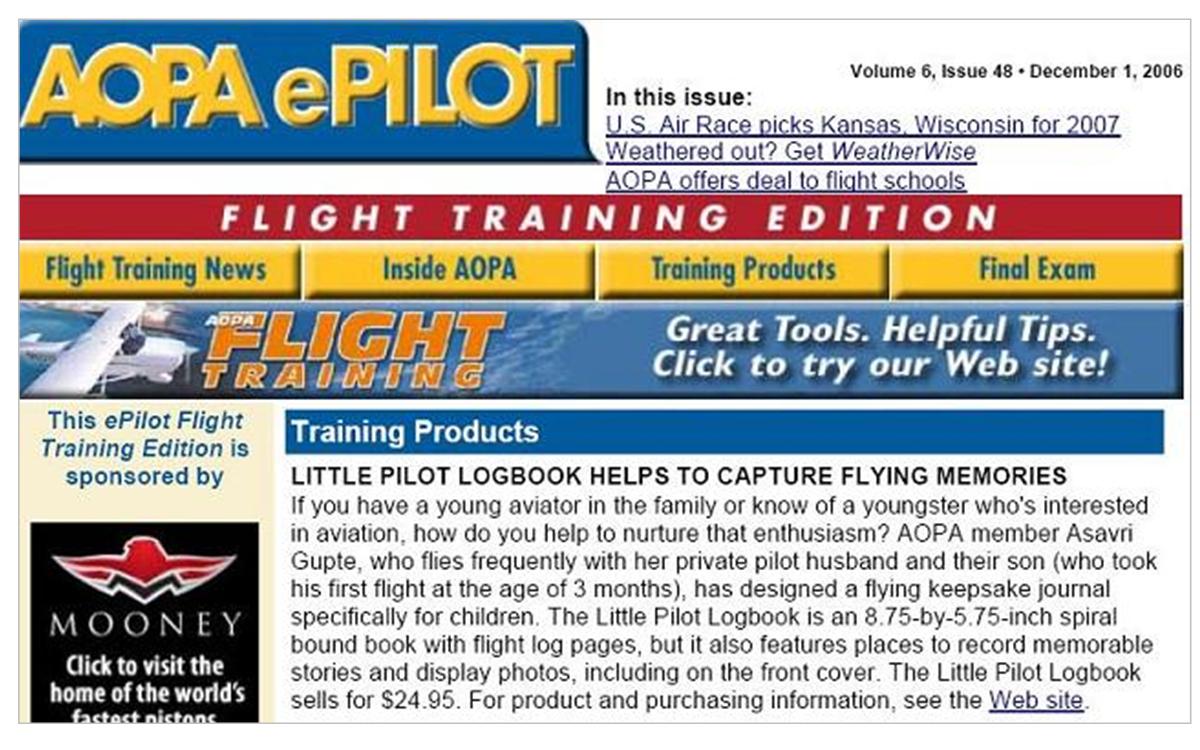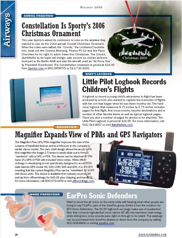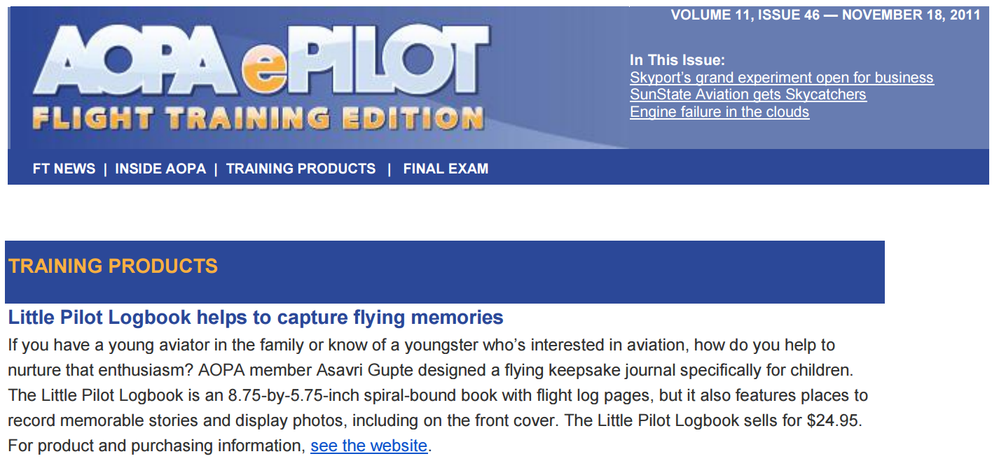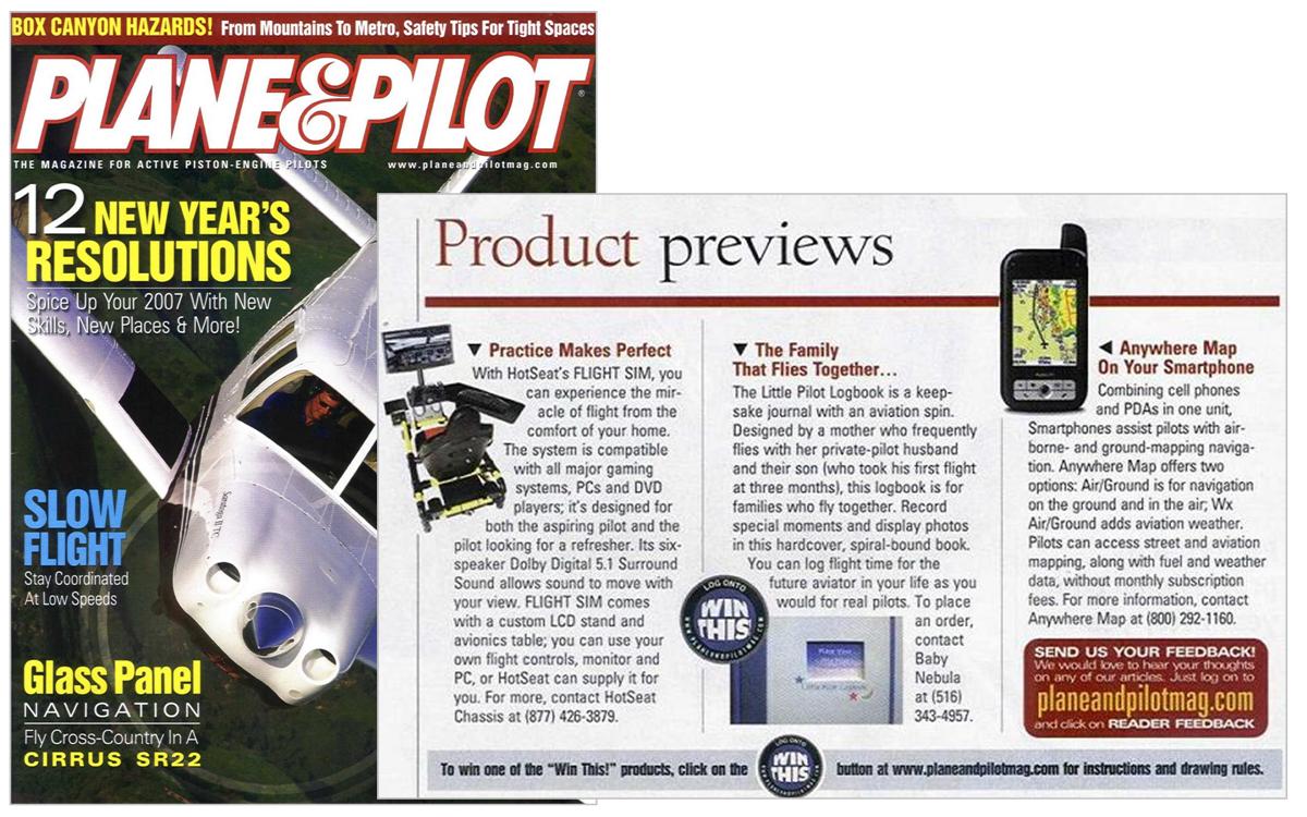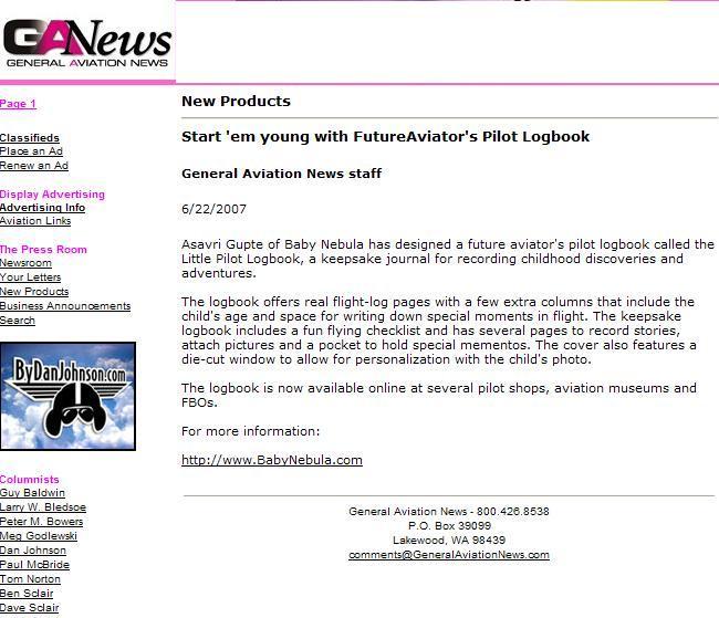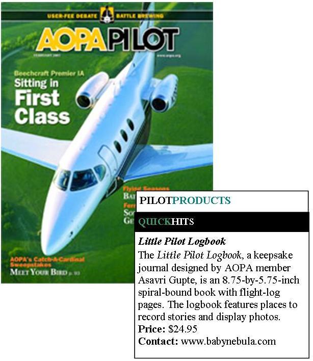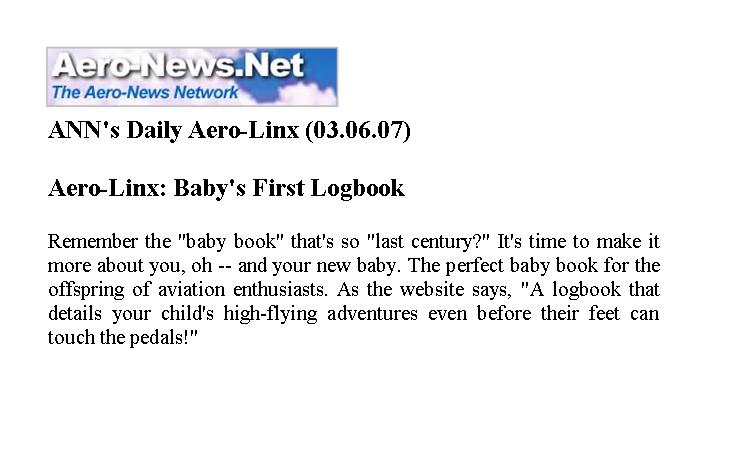 Press Flying Magazine, December 2006 AOPA ePilot, December 2006 Plane & Pilot Product Previews, January 2007 AOPA Magazine, February 2007 General Aviation News, June 2007 Aero-News.Net, March 2007 Southern Aviator Sun & Fun Edition, May 2007 JohnnyJet.com Travel Magazine Johnny Jet Magazine, August 2007 AV Web Picture of the Week AV8RConnection, July 2008 News from 39N, March 2007. Princeton Airport Mad Science of Long Island, August 2013 Suite101.com, November 2009. “A great gift for babies, children… or maybe their parents or grandparents” by Helen Krasner AOPA Flight Training Edition, November 2011 Airport Journals April 2007 “Logbooks and Checklists Aren’t Just for Pilots” Share this:TweetEmailLike this:Like Loading...